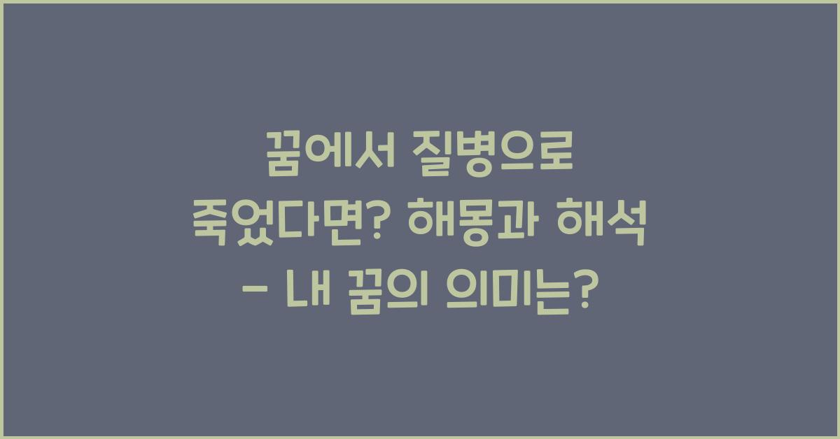 그럼, 질병으로 죽는 꿈이 과연 어떻게 해석될 수 있는지, 보다 자세히 알아보겠습니다. 꿈에서 질병으로 죽었다면? 해몽과 해석 | 꿈해몽 꿈풀이 꿈해석 꿈의미를 통해, 각 상황에 따른 해석들을 살펴보는 기회가 될 것입니다.