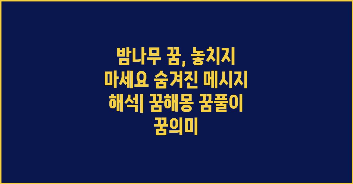 꿈은 특별한 메시지를 담고 있습니다. 밤나무 꿈, 놓치지 마세요! 당신의 미래를 보여주는 꿈 | 꿈해몽 꿈풀이 꿈해석 꿈의미. 이 꿈의 메시지를 받기 위해 당신의 마음을 열고, 직관을 따라 행동해보세요. 그리고 여러분의 주변 사람들과 이 꿈에 대한 이야기를 나누는 것 또한 매우 의미 있는 활동이 될 것입니다.