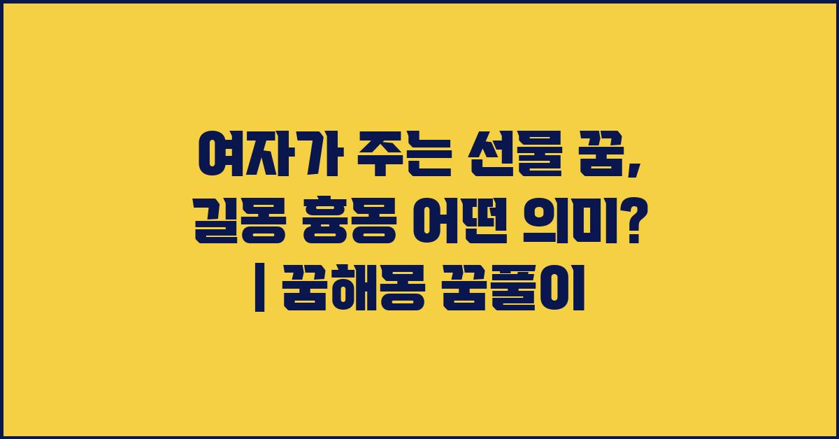 여자가 주는 선물 꿈은 그 자체로 많은 의미를 내포하고 있으며, 꿈의 내용과 당신의 감정, 그리고 선물의 성격에 따라서 길몽 혹은 흉몽으로 해석될 수 있습니다. 여자가 주는 선물 꿈, 길몽일까 흉몽일까? | 꿈해몽 꿈풀이 꿈해석 꿈의미를 명확히 이해하려면 꿈 전체의 맥락을 신중하게 살펴보는 것이 중요합니다. 이 꿈이 긍정의 신호일 수 도, 경계의 표시일 수도 있음을 항상 기억해야겠습니다.